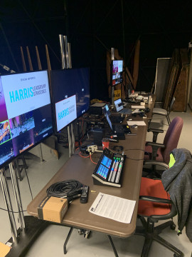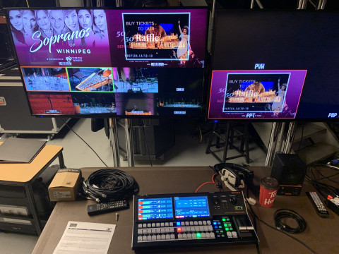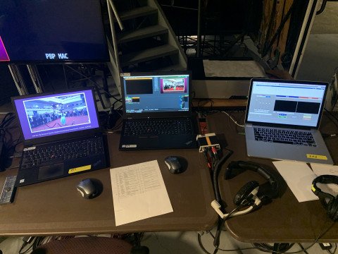 For any stream, you need a microphone to capture the audio and a camera to capture the video. The signals from each are fed to a computer or an encoder which converts the signals to a format for transmission over the internet. Finally, you need an internet connection with adequate bandwidth to support the signal. Because we had more than one microphone and more than one camera, we needed additional equipment: an audio mixing console, a device to control cameras remotely, and another to switch between different cameras to create the final visual presentation.