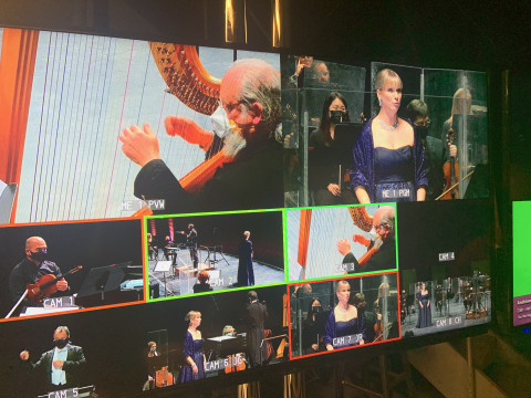 No one other than venue staff, performers, and essential production staff were allowed in the building for the event. The orchestra musicians arrived at the Concert Hall backstage entrance and were screened for COVID symptoms at the door. They then followed a pre-determined route through the backstage area to get to their place(s) on stage.